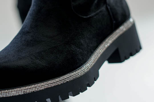 Stijlvolle Celestia Suede Vetvel Laarzen met een chique glitterrand en verstelbare touwtjes aan de achterkant voor de perfecte pasvorm. Elegant, comfortabel en perfect voor elke outfit!