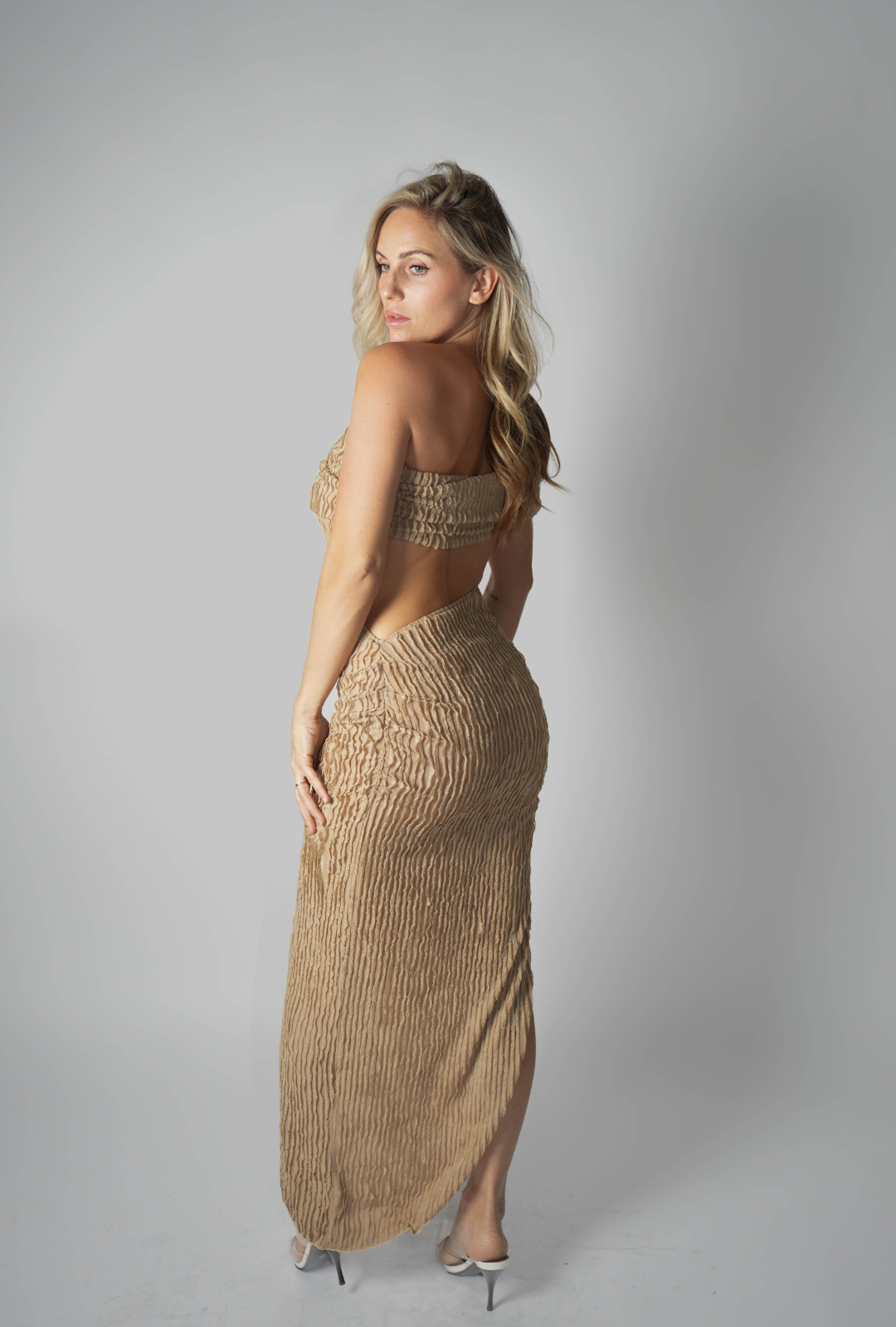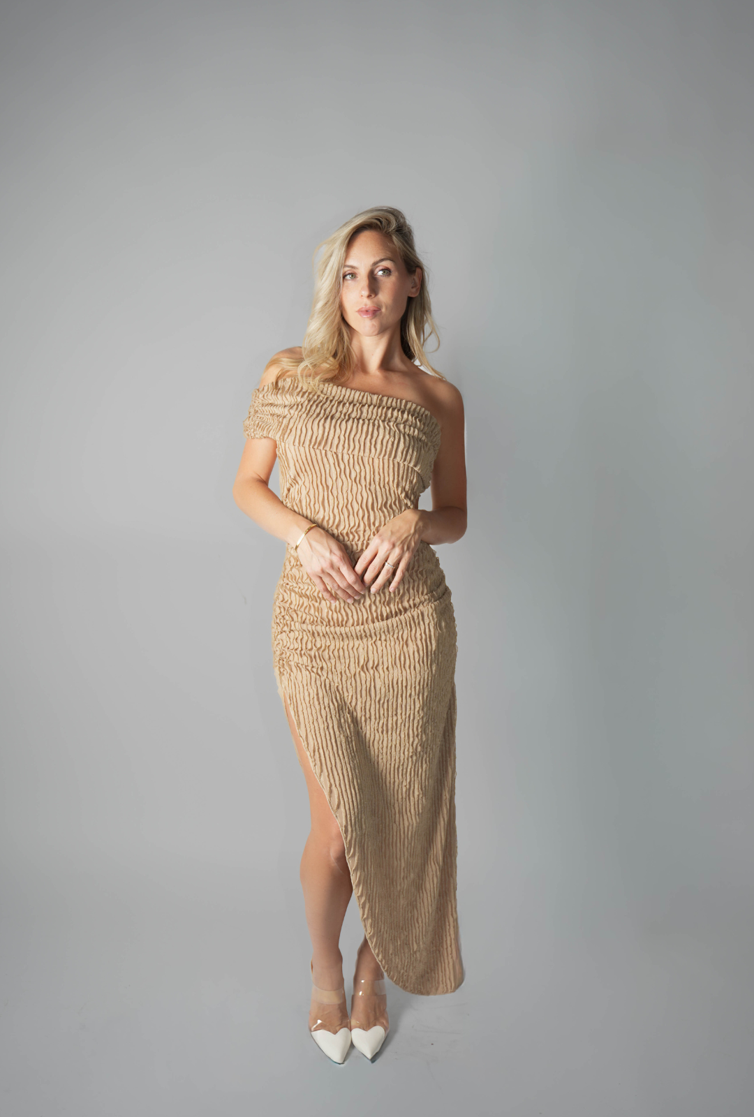Straal in de Saphire dress in goudkleur met off shoulder en een split. Perfect voor de de avond of feest. .